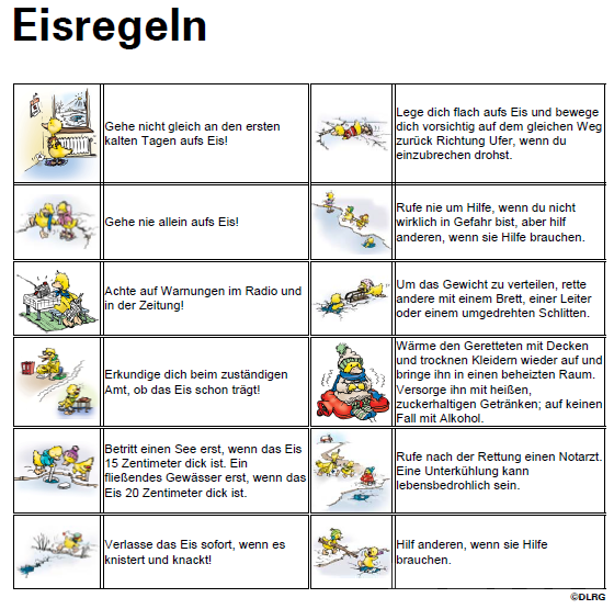 „Ab einer Eisdicke von 15 Zentimetern können stehende Gewässer gefahrlos betreten werden, fließende erst ab 20 Zentimetern!“