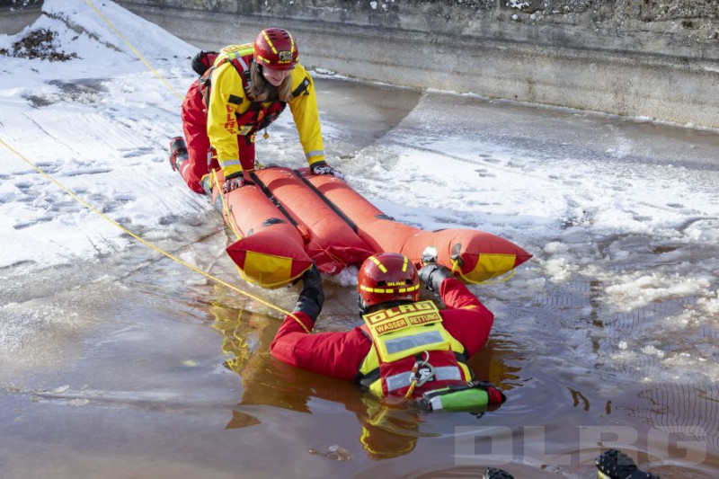 DLRG Einsatzkräfte üben Eisrettung mit einem Eisretter. [Quelle: Paul-Philipp Braun]