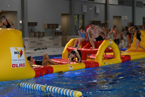Bei dem so genannten Aqua-Track handelt es sich um einen etwa 17m langen Parcour auf dem Wasser, bei dem es zahlreiche Hindernisse zu bewältigen gilt. Große Hürden, schmale Stege, rutschige Flächen. Hier ist viel Geschicklichkeit und Fitness gefragt.