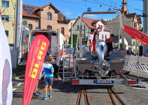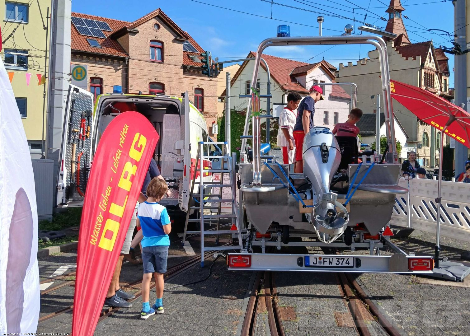 Die große Attraktion, selbst von der Straße aus sichtbar, war das Katastrophenschutzboot. Jedes Kind durfte sich als Bootsführer ausprobieren, natürlich mit Blaulicht und Hupe.